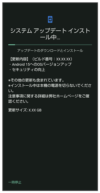 - システムアップデート中もほかの機能を使用できます。ただし、システムアップデートの通知後10日間は、システムアップデート中にほかの機能を使用していると、アップデートのインストールが一時的に停止されます。をタップすると、インストールが再開され、ほかの機能も使用可能になります。