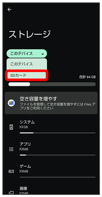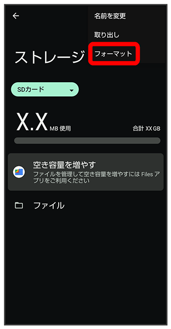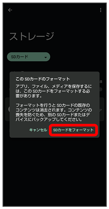 - フォーマットすると、SDカード内のデータがすべて消去されます。SDカードをフォーマットするときは、ご注意ください。