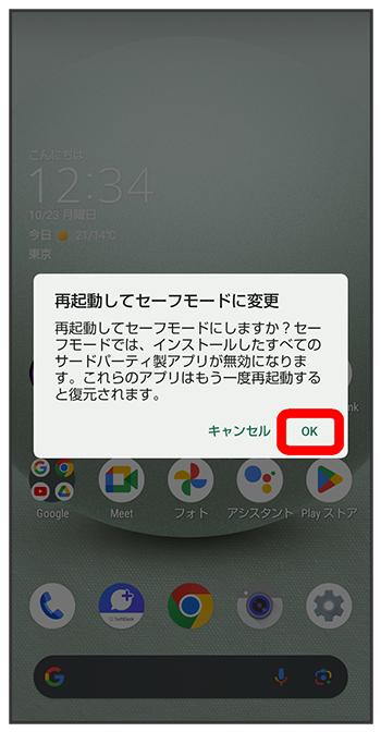 - セーフモード中は、機内モードに設定されます。セーフモードを解除しても、機内モードの設定が維持されますのでご注意ください。