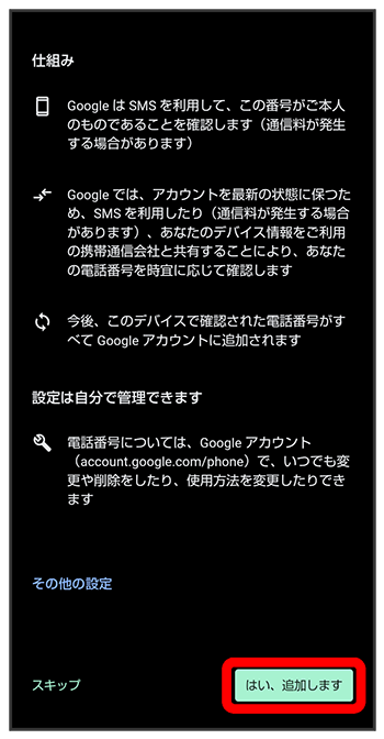 - セキュリティ保護目的でのみ電話番号を追加するときは、をタップします。以降は画面に従って操作してください。