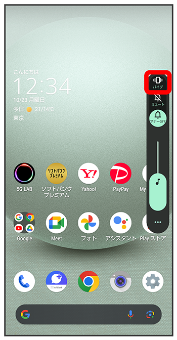 音量Upキー/音量Downキーを押して音量バーを表示させ、マナーモードが解除されます。