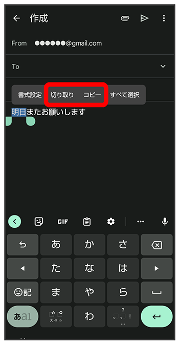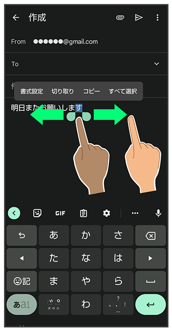 を左右にドラッグして、切り取り/コピーする文字を選択