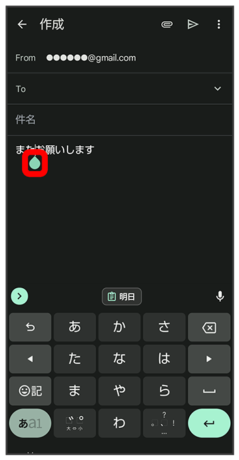 をドラッグすると、貼り付ける位置を調節できます。- ツールバーに切り取り/コピーした文字が表示されているときは、表示された文字をタップしても、貼り付けられます。