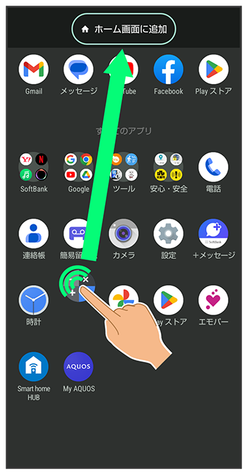 アプリ一覧画面でアプリをロングタッチし、「ホーム画面に追加」までドラッグ