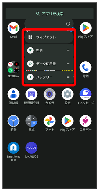 アプリをロングタッチすると、アプリにより機能へのショートカットが表示される場合があります。機能ショートカットをロングタッチし、ホーム画面の追加したい位置で指を離すと、機能へのショートカットとして追加することができます。