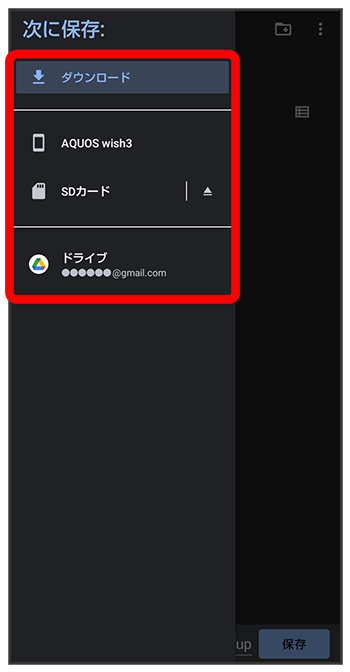 - SDカードはSDカードを挿入している場合、Google ドライブはGoogle アカウントを設定している場合に表示されます。
