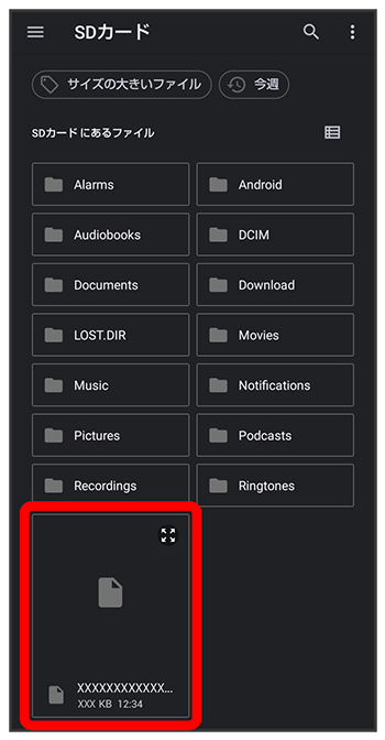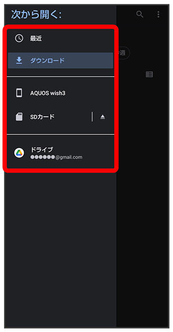 - SDカードはSDカードを挿入している場合、Google ドライブはGoogle アカウントを設定している場合に表示されます。