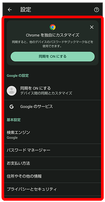 | 同期を ON にする | Google アカウントでログインして、ブックマークや履歴などの設定を利用できます。ログインすると、アカウント情報が表示されます。 |