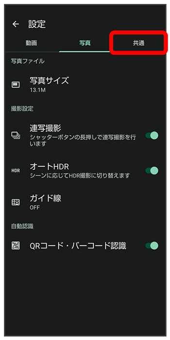 | セルフタイマー表示 | 写真/動画撮影画面にセルフタイマーのアイコンを表示するかどうかを設定します。 |