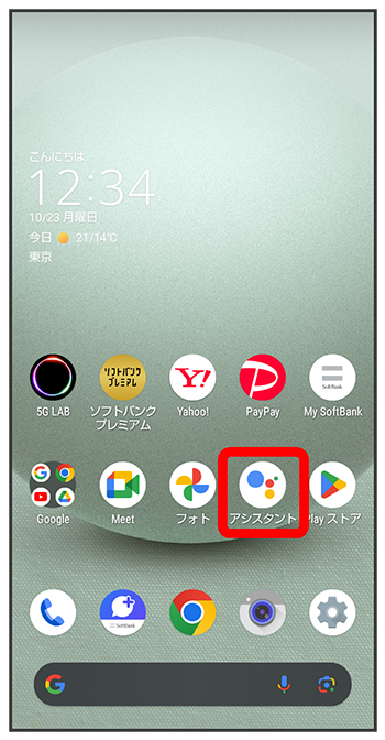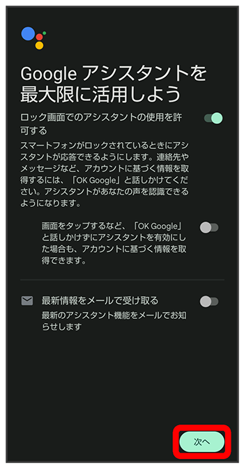 (アシスタント)をタップする代わりに、画面点灯時に本機に「Hey Google」と話しかけることで、音声操作が利用できます。Voice Matchを使いたい場合は、をタップしたあと、画面に従って操作してください。