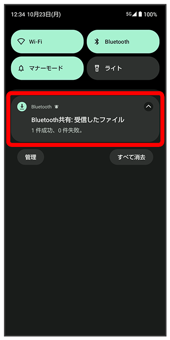 が表示されます。ステータスバーを下にフリックしてBluetooth®共有通知をタップしてください。
