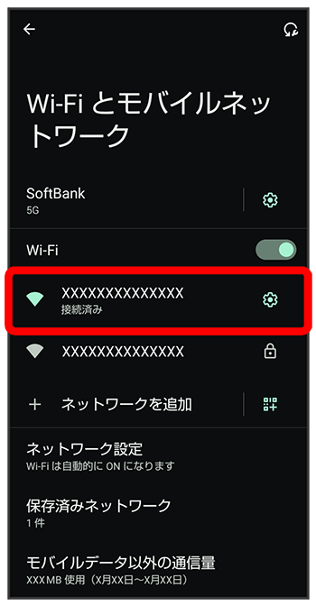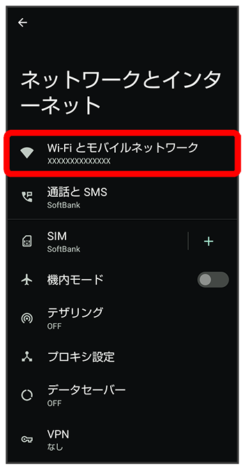 Wi-Fiとモバイルネットワーク画面が表示されます。