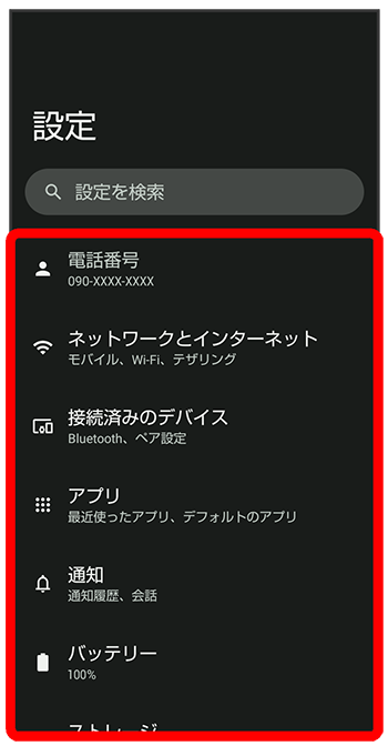 画面上部の検索バーをタップすると、設定メニュー内の項目を検索できます。