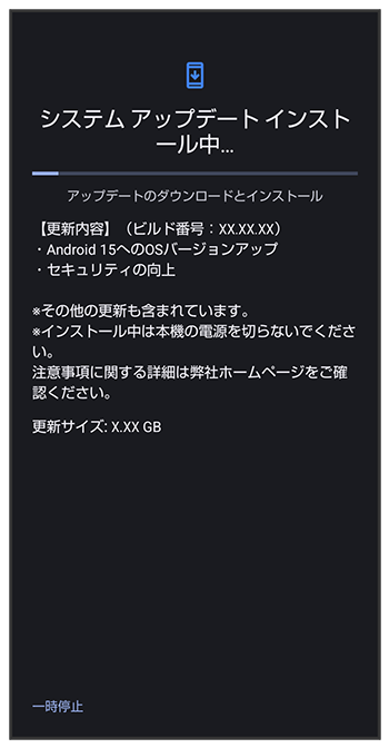 - システムアップデート中もほかの機能を使用できます。ただし、システムアップデートの通知後10日間は、システムアップデート中にほかの機能を使用していると、アップデートのインストールが一時的に停止されます。をタップすると、インストールが再開され、ほかの機能も使用可能になります。