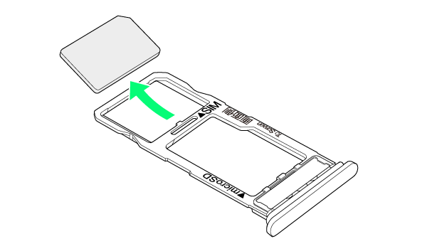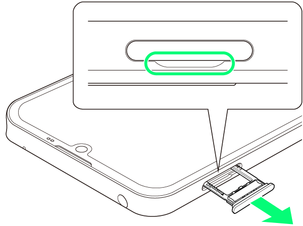 - ディスプレイを上にして、カードトレイを引き出してください。ディスプレイを下にしたり、本機を立てた状態でカードトレイを引き出すと、SIMカードやSDカードがカードトレイから外れ、紛失する可能性があります。