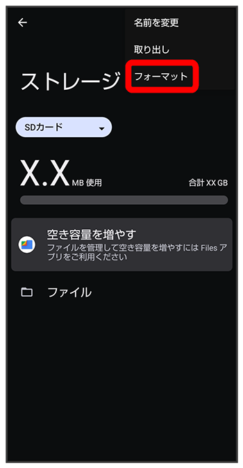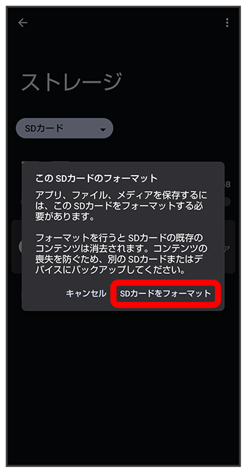 - フォーマットすると、SDカード内のデータがすべて消去されます。SDカードをフォーマットするときは、ご注意ください。