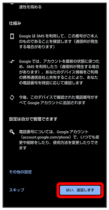 - セキュリティ保護目的でのみ電話番号を追加するときは、をタップします。以降は画面に従って操作してください。