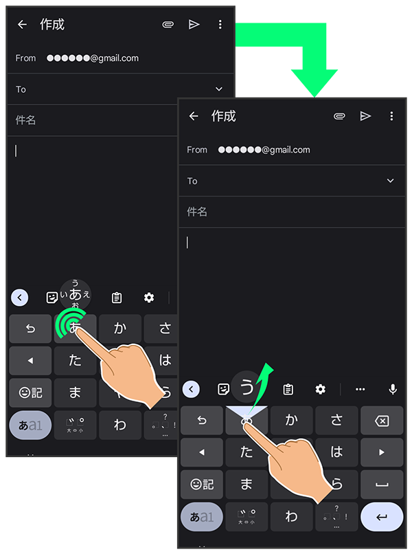 - キーをロングタッチすると、キー入力ガイドがポップアップで表示されます。キーをタップしたまま入力する文字の方向へフリックし、入力します。