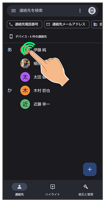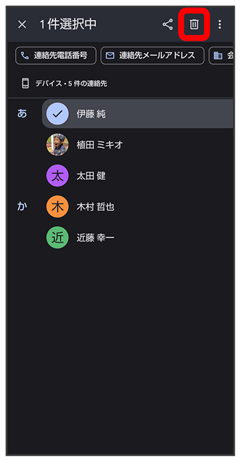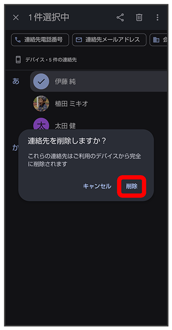 対象の連絡先をタップしても、対象の連絡先を選択できます。複数の連絡先を削除する場合は、続けてほかの対象の連絡先をタップします。