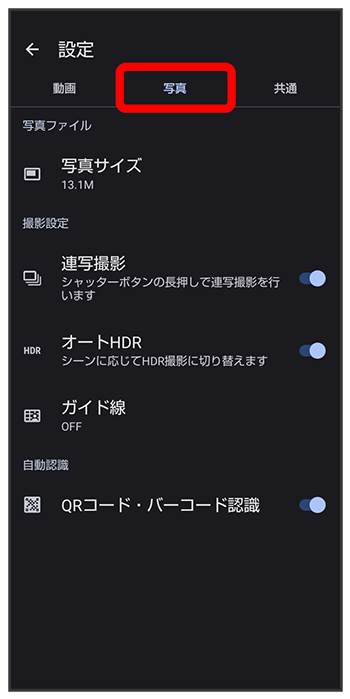 | オートHDR | 逆光などコントラストが強いシーンで、自動で白とび・黒つぶれを軽減して撮るかどうかを設定します。 |