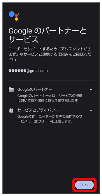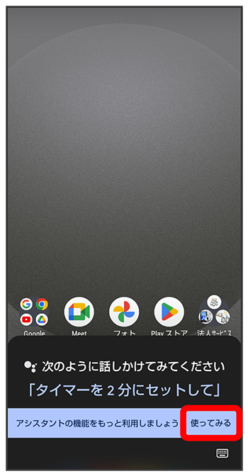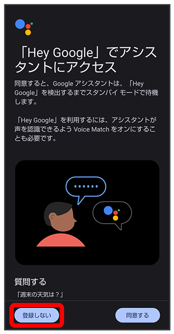 (アシスタント)と操作する代わりに、画面点灯時に本機に「Hey Google」と話しかけることで、音声操作が利用できます。Voice Matchを使いたい場合は、をタップしたあと、画面に従って操作してください。
