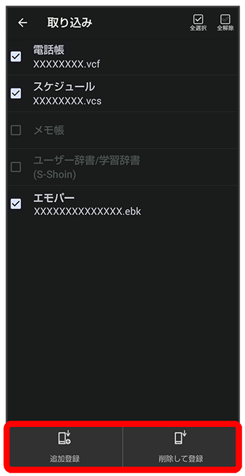 ユーザー辞書を取り込む場合、内部ストレージに保存されているユーザー辞書のデータが削除されますのでご注意ください。