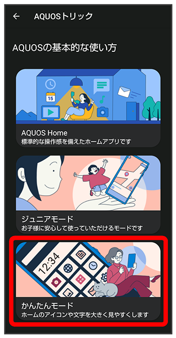簡単で見やすいホーム画面と読みやすい文字に設定できます。