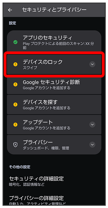 - 画面ロック解除方法の設定について詳しくは、「パターンを指でなぞって画面ロックを解除するように設定する」、「ロックNo.(PIN)で画面ロックを解除するように設定する」、「パスワードで画面ロックを解除するように設定する」を参照してください。
