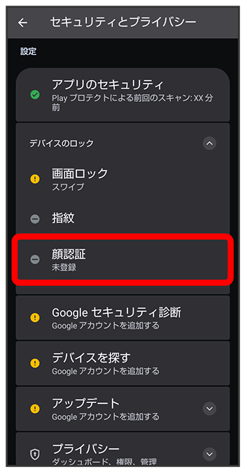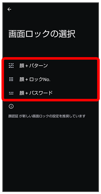 セキュリティとプライバシー画面でパターン/ロックNo.(PIN)/パスワードを入力顔認証についてのご注意