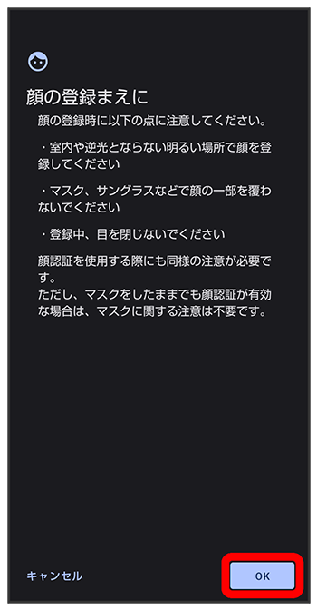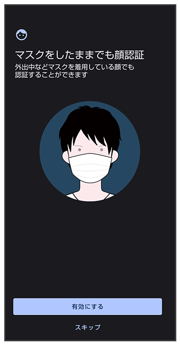 画面のガイドに顔を合わせる「マスクをしたままでも顔認証」について設定