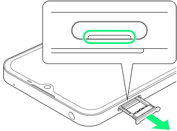 - ディスプレイを上にして、カードトレイを引き出してください。ディスプレイを下にしたり、本機を立てた状態でカードトレイを引き出すと、SIMカードやSDカードがカードトレイから外れ、紛失する可能性があります。