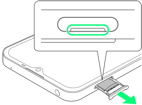 - ディスプレイを上にして、カードトレイを引き出してください。ディスプレイを下にしたり、本機を立てた状態でカードトレイを引き出すと、SIMカードやSDカードがカードトレイから外れ、紛失する可能性があります。