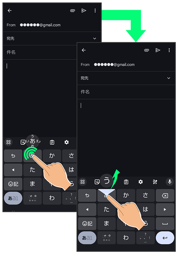 - キーをロングタッチすると、キー入力ガイドがポップアップで表示されます。キーをタップしたまま入力する文字の方向へフリックし、入力します。
