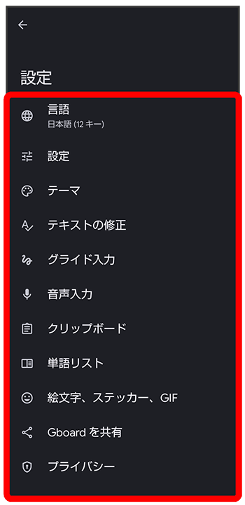 Gboardに関する動作を設定できます。設定できる項目は次のとおりです。