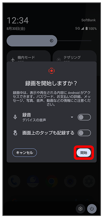 スクリーンレコード開始画面で「画面上のタップも記録する」の