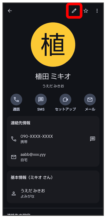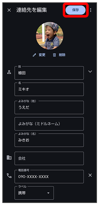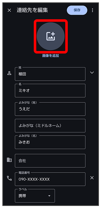 - 連絡先に画像が設定されている場合は、設定されている画像またはをタップするとと表示されます。をタップすると、画像を削除することができます。