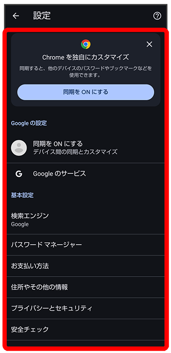 | 同期をONにする | Google アカウントでログインして、ブックマークや履歴などの設定を利用できます。ログインすると、アカウント情報が表示されます。 |