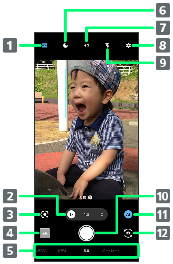 - インカメラの場合、有効にするとフラッシュの代わりに画面全体が発光し、夜の自撮りでも人物が明るく撮れます(セルフィーフラッシュ)。