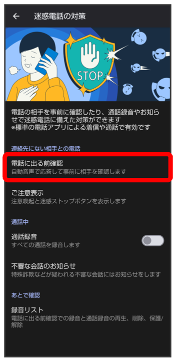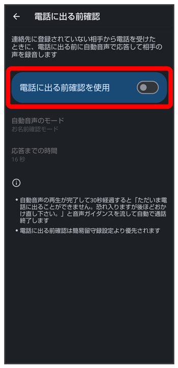 電話に出る前確認を有効にする
