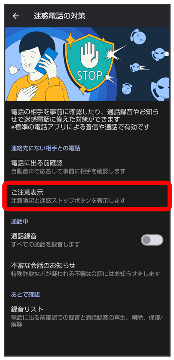 電話帳に登録していない電話番号や、発信者番号が非通知の相手からの着信/通話中に、注意を促す画面を表示します。