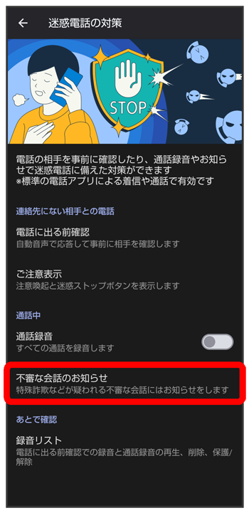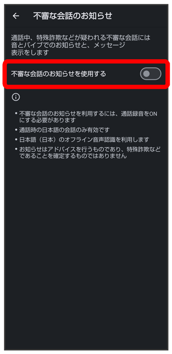 )が切り替わります。 - 不審な会話のお知らせを利用するには、を有効にする必要があります。確認画面が表示されたときは、画面に従って操作してください。