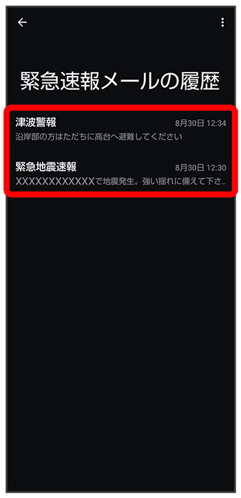 以前に受信した緊急速報メールを確認する