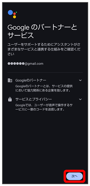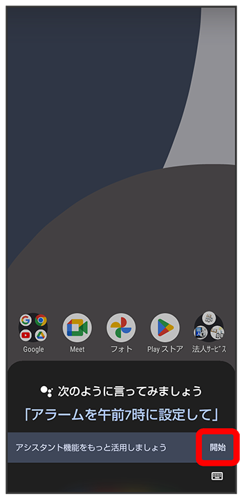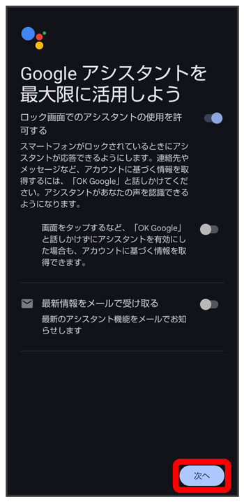 (アシスタント)と操作する代わりに、画面点灯時に本機に「Hey Google」と話しかけることで、音声操作が利用できます。Voice Matchを使いたい場合は、をタップしたあと、画面に従って操作してください。
