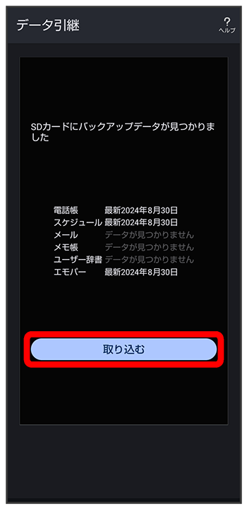 ほかの機器でSDカードに保存したデータ(電話帳、スケジュール、メール、メモ帳、ユーザー辞書、エモパー)を、本機に取り込むことができます。