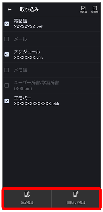 ユーザー辞書を取り込む場合、内部ストレージに保存されているユーザー辞書のデータが削除されますのでご注意ください。