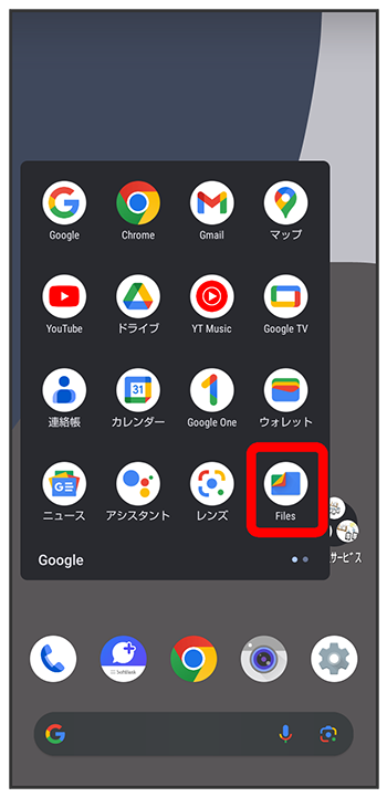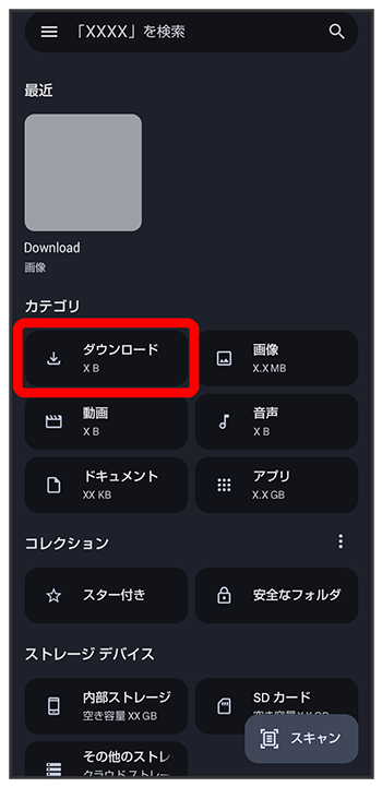 ダウンロード画面で、ファイルをロングタッチ- リスト表示でファイル名の右の