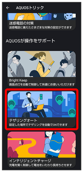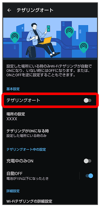 テザリングオート画面で削除したい場所のWi-Fiテザリングが有効になるタイミングを設定する