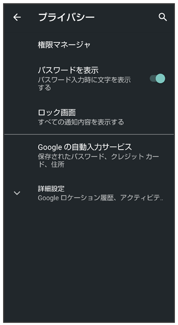 | 詳細設定 | が追加され、デバイスを持って訪れた場所を保存するかどうかを設定できます。 が追加され、Google に保存を許可するアクティビティと情報を選択できます。 が追加され、IDのリセットなどの広告の設定ができます。 が追加され、診断データとデバイスやアプリの使用状況データを Google に自動的に送信するかどうかを設定できます。 |