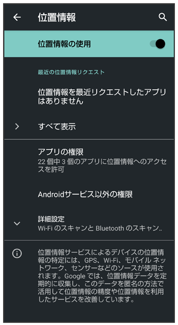 | Androidサービス以外の権限 | Android サービス以外からの位置情報に対するアクセス権限を変更することができます。 |