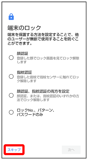 - 画面ロック解除方法をタップと操作すると、選択した画面ロック解除方法の設定ができます。詳しくは、「指紋認証機能を利用する」、「セキュリティと現在地情報の設定」、「パターンを指でなぞって画面ロックを解除するように設定する」、「ロックNo.(PIN)で画面ロックを解除するように設定する」、「パスワードで画面ロックを解除するように設定する」を参照してください。